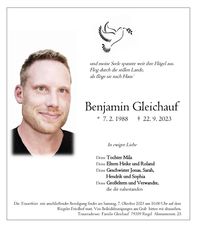 erst heute habe ich vom Tod deines Jungen erfahren. Dies tut mir unendlich leid. Ein Kind zu verlieren ist das Schlimmste was einem Menschen widerfahren kann. Ich erinnere mich gut, wir unterhielten uns oftmals über unsere Kinder, auch wenn das zwischenzeitlich 20 Jahre her ist. Zu deinem unsagbaren Verlust möchte ich dir und deiner Frau mein tief empfundenes Beileid bekunden. Wenn du jemanden zum Reden brauchst, bin ich gerne für dich da. In der schweren Zeit wünsche ich dir viel Kraft und Zuversicht